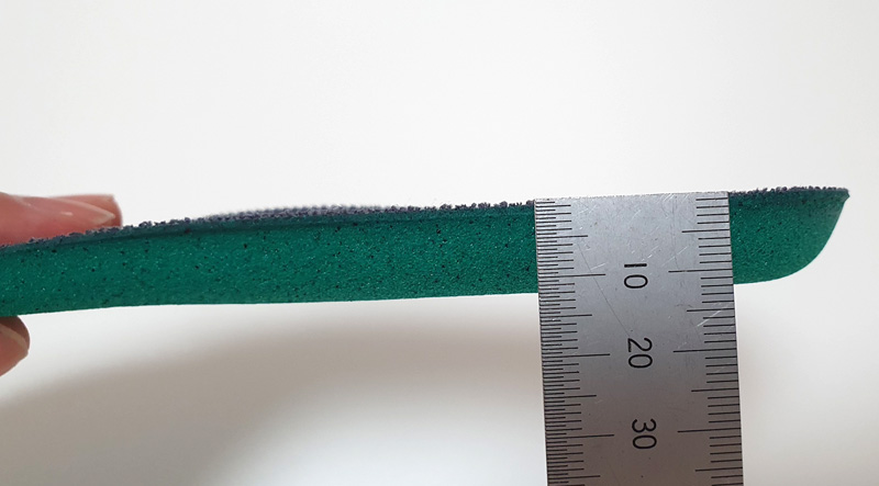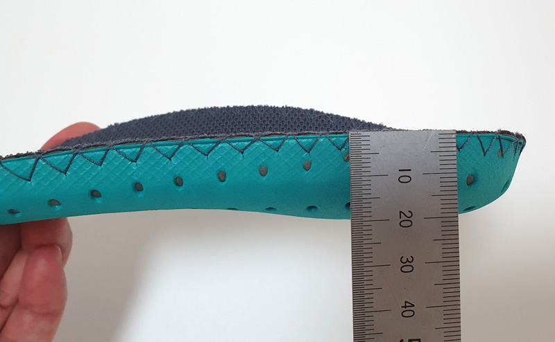 아치와 뒤꿈치를 잡아주기 위해 깔창 외측이 올라온 걸 감안하면 실제 쿠션 높이는 1cm 정도일듯하다.