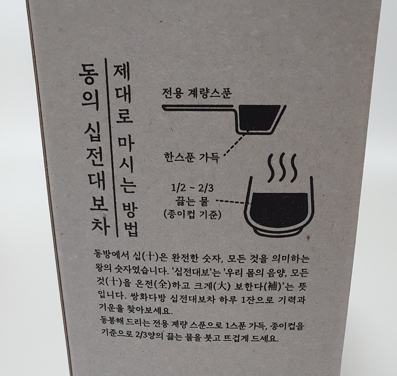 커피도 마시고 나면 좀 더부룩한 느낌이 들고 해서 한방차를 마셔보면 어떨까 하고 생각해 십전대보차를 구입해보았다.
