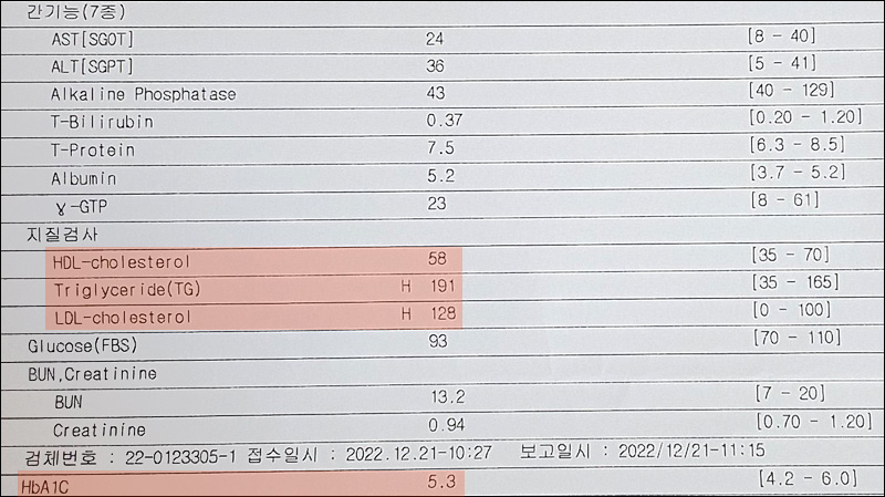 2023년에는 정상수치에 들어가는 것을 목표로 고지혈증 약을 꾸준히 먹어봐야겠다.