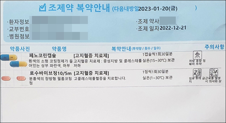 지난 9월부터 고지혈증 치료제 로수바미브정 10/5mg과 페노코린캡슐을 처방받아 꾸준히 복용 중이다.