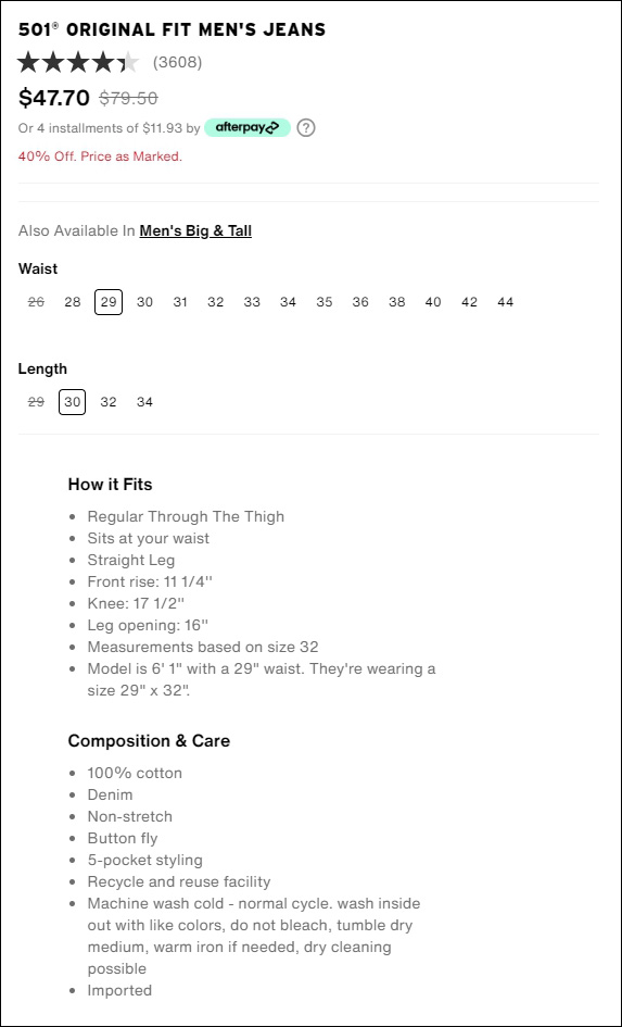 리바이스 501 실제색감과 사이즈
