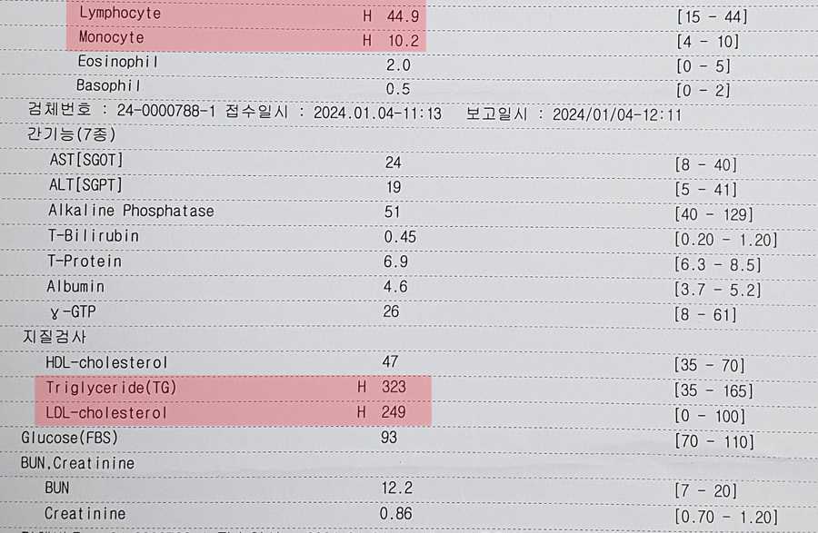그 외 백혈구 종류인 Lymphocyte 림프구 수치와 Monocyte 단핵구 수치가 정상범위보다 살짝 높았다.