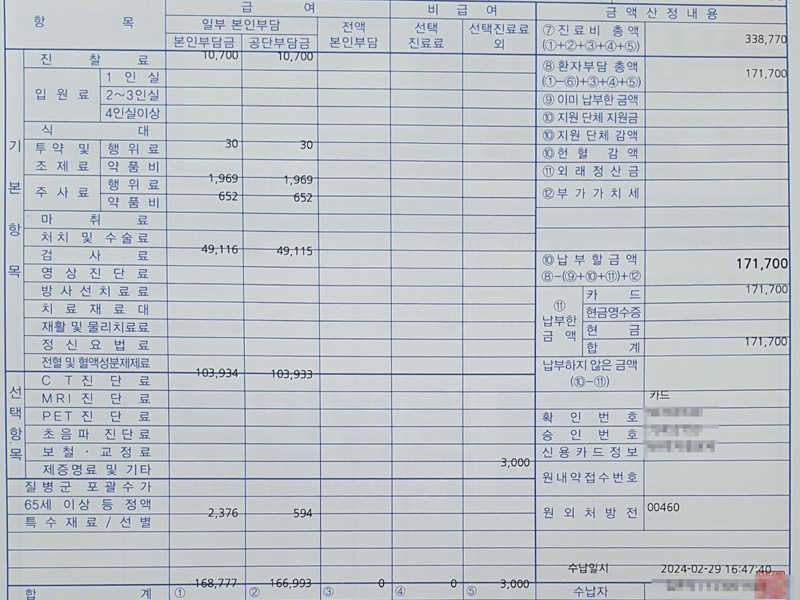 피검사, 엑스레이촬영, 뇌ct촬영 세가지 검사에 17만원이 나왔는데